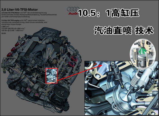 与我们以往所熟悉的奥迪发动机相同的是,这一新款引擎同样用到了这样几个字符“T”、“FSI”。掀开奥迪A6L(图库论坛)2.0T轿车的引擎罩后你会发现引擎上的“TURBO”和“FSI”字样;大众迈腾(图库论坛)的2.0TSI引擎也是把“TSI”当作宣传的重点,而前面所提到的“T”也的确代表着“涡轮增压”技术。因此奥迪的新款3.0TFSI引擎把这四个字母放在一起,就让人很容易联想成为“3.0涡轮增压+燃油直喷”。