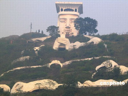 资料图:经过十多年的建设,在重庆丰都名山与双桂山之间山顶上的“天堂仙境”景区初具规模,“玉皇大帝”仙袂飘飘。据了解,这片景区由“天界”、“日宫”、“月宫”等景点组成,总建筑面积约两万平方米,山顶上头戴皇冠的玉皇大帝头像是座塔楼,将被辟为宾馆。目前丰都的旧城拆迁仍在进行之中,2009年三峡大坝三期工程完工后,长江水位增到175米,丰都鬼城将成为江中半岛,届时“玉皇大帝”将背山临水,成为库区的新景观。 中新社发 文宝 摄