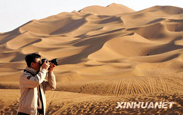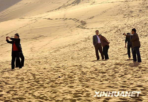 游客在沙山公园内一座沙山上拍照留影(11月8日摄)。 新华社记者 赵戈 摄