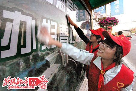 ![]() 在曹妃甸论坛即将召开之际,唐山市全民动员,机关干部、社区老党员、文明单位职工、大学生志愿者纷纷走上街头,参与到市容治理,清理卫生行动当中,使唐山以崭新的面貌迎接曹妃甸论坛的召开。图为志愿者走上街头擦洗候车厅。燕赵都市报冀东版记者陈洁摄 |
