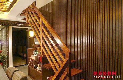 木制的楼梯在体现出风格的同时也为房间节省了空间,在楼梯下的小组合柜上的摆设为房间增添了一份风雅的情调。