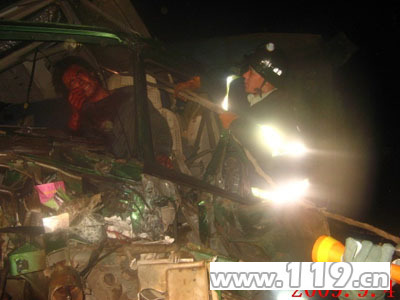 到达现场后,消防人员发现因为夜晚天降大雨,道路比较湿滑导致两辆三友车发生追尾事故,其中一辆三友车的驾驶室严重变形,驾驶员的下半身被牢牢地卡在驾驶室内不能动弹,他的腿部、头部多处受伤,满身血迹,表情十分痛苦。此外,由于发生车祸时车辆一直未熄火,加之受到剧烈撞击后车辆的油路一直在漏油,致使车辆随时有发生爆炸的危险。于是,一名消防人员出一支水枪进行掩护,其他消防人员对被困司机展开救援。由于驾驶室严重变形,车内空间狭窄,破拆工具无法使用。消防人员首先用交警大队的牵引车对车辆的驾驶室进行牵引,在驾驶室的空间加大后,利用无齿锯、液压剪切钳等工具对驾驶室进行破拆,经过全体消防人员二十分钟的共同努力,被困司机成功获救,并被送往医院进行救治。