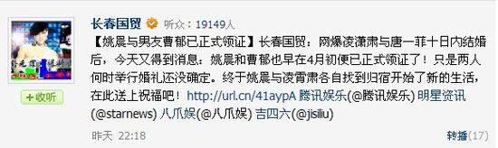 腾讯娱乐讯知名博客写手长春国贸于6月4日晚发布微博爆料姚晨与曹郁已于4月初低调结婚领证,婚礼日期尚未确定。对于此消息,双方目前尚未作出任何回应。