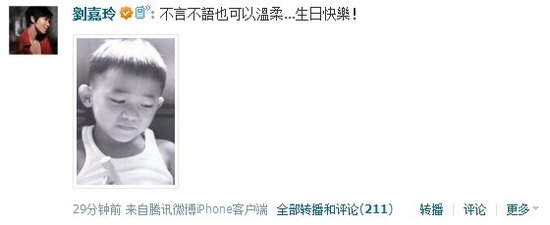27日凌晨,刘嘉玲就更新腾讯微博,上传了这一行伟仔的可爱童年照,写道“不言不语也可以温柔……生日快乐!”言语间透露着甜蜜。
