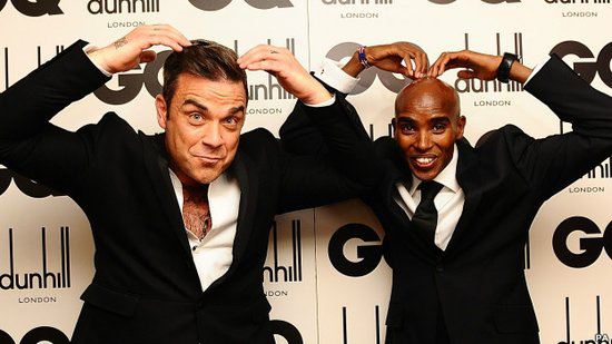 歌星罗比·威廉姆斯和奥运双料长跑冠军莫·法拉在GQ颁奖晚会上合影