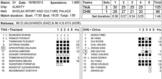 北京时间9月16日晚上,2012年女排亚洲杯在哈萨克斯坦的阿拉木图展开决赛厮杀,卫冕冠军中国女排和泰国女排强强碰撞,中国队1比3(28比30、27比25、21比25、20比25)不敌对手,三连冠梦想破碎,俞家军未能完美收官。泰国队则史上首次赢得亚洲杯冠军。