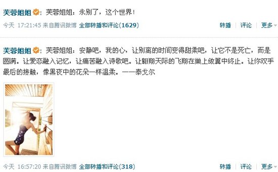 9月19日下午17点21分左右,网络红人芙蓉姐姐突然发微博称:“永别了,这个世界!”,一时间引起众多网友转发评论。不少网友担心芙蓉姐姐会轻生,纷纷劝说她别做傻事,别把网上的冷嘲热讽太当回事。网友吴思慧就留言鼓励她说:“别啊,芙蓉姐姐你是我们的励志女神。”