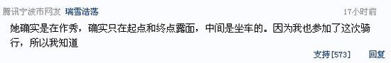 随后,腾讯网友“瑞雪浩荡”也表示,“她确实是在作秀,确实只在起点和终点露面,中间是坐车的。因为我也参加了这次骑行,所以我知道。”