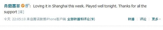 而在另外一场1/4决赛中,肖恩-墨菲展现出了一如既往的稳定,以5-1的大比分横扫宾汉姆挺进四强。赛后,“稳定先生”在微博上点评了自己的表现,发表了这一周在上海的感受,同时也对所有支持他的球迷表示了感谢:“ Loving it in Shanghai this week. Played well tonight. Thanks for all the support (本周在上海过的很开心,今晚打的不错,感谢大家的支持。)” (刘成奇)