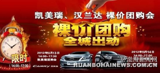 特大喜讯:广汽丰田中润路南店为回馈新老客户的支持,特向厂家申请部分垄断车型,“0”利润销售,特于10月13、14日店内举办震撼全城的“凯美瑞、汉兰达裸价团购会”,总经理亲临现场,另外活动期间特推出三台特价车,本次活动只针对网上报名客户。具体活动内容如下:
