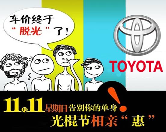 汽车也是生活的伴侣,随着社会经济的高度发展,汽车已经渐渐走入了平常百姓的家庭,我们每个人都渴望拥有一辆属于自己的坐骑。即使没有情侣的陪伴,即使没有朋友的召唤,我也可以驾驭自己的爱车,风驰电掣一番,去享受美好的生活。在这节日到来之际,让您与丰田把光棍结了吧!不一样的丰田岁末促销挑战您锐利的眼光。