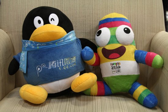 QQ公仔与吉祥物“砳砳”合影