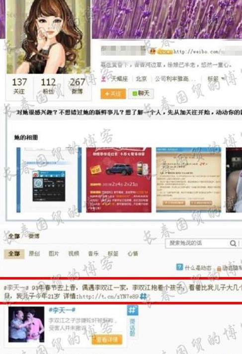 长春国贸在博客中称,“2月26日,长春国贸看到又有网友关于李天一年龄的爆料,该网友发微博称:“93年春节去上香,偶遇李双江一家,李双江抱着个孩子,看着比我儿子大几个月,我儿子今年21岁。”暗指李天一年龄应该在21岁以上。看了这条微博后,长春国贸联系到了该网友,她表示:她家每年正月初一都会去香山敬香祈福,这一习惯已经保持好多年了。1992年10月26日她的儿子出生。1993年大年初一,他们按惯例去了香山,在那里偶遇李双江和梦鸽一家,当时李双江抱着儿子,梦鸽在旁边,还带了两个穿军装的人跟在后面。“那时,他的儿子看着要比我儿子大好几个月呢!”如果按照片该网友的说法,李天一今年年龄已经超过21岁了。”