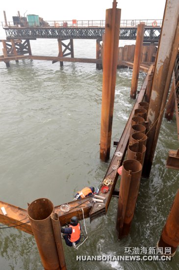 总投资超过100亿元、计划2013年建成投产的中国石油唐山液化天然气项目(简称LNG码头)在曹妃甸紧张施工中。为保证工程节点按期完成,负责施工的中交一航局一公司第五项目部实施冬春不间断施工。图为悬空作业的焊工师傅在焊接钢梁。 记者赵勇摄