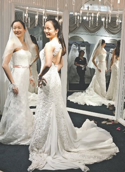 蒋文文(左)蒋婷婷试穿挑选的婚纱
