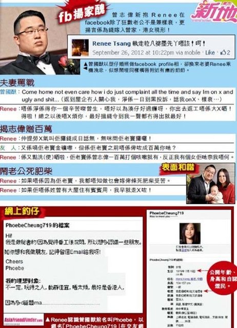 [导读]去年12月曾志伟(微博)涉嫌掌掴黄浩被落案起诉,本月须第4度返警署报到。娱圈不太平,家事更加乱。其儿媳妇Renee(张可蕙)被揭在网上爆粗狂数夫家,传志伟为免在官司期间添乱,已将儿子和新抱逐离家。