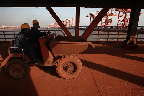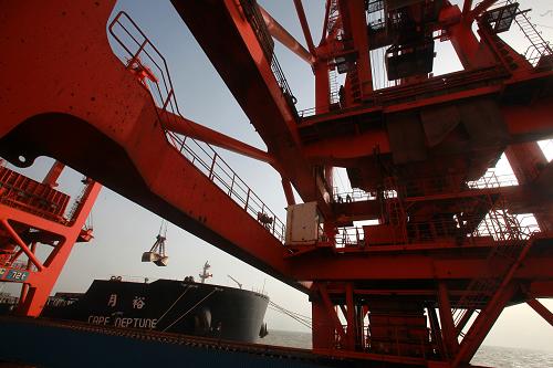 10月10日,在河北省曹妃甸港码头,吊车卸下从澳大利亚进口的铁矿石。2013年前8个月曹妃甸港区吞吐量突破1.59亿吨,全年吞吐量预计将突破2.4亿吨,单独排名有望进入全国前十名。随着正在建设的煤炭、木材、钢材、矿石、可再生能源、天然气等六大宗商品交易平台的完善,曹妃甸港正在从集疏港向综合贸易大港转变。新华社记者 刘宇 摄