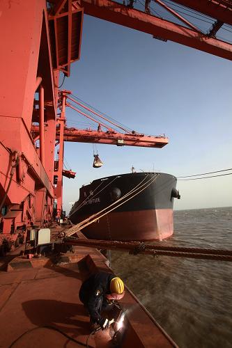 10月10日,工人在河北省曹妃甸港码头作业。新华社记者 刘宇 摄