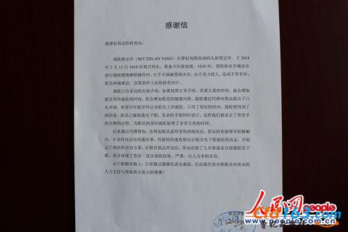 | 图为船方致以该站的感谢信 |