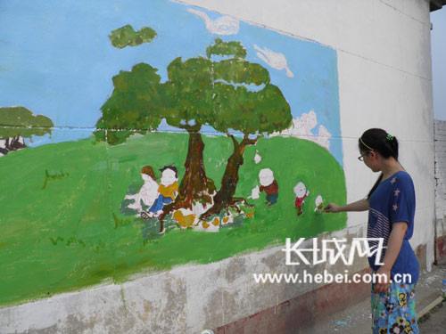 原来,参加完高考,9名美术应届毕业生在完成他(她)们人生道路的第一次冲刺后,想着还要做点什么。恰巧曹妃甸四农场找学校联系美化村街环境,师生们一拍即合,决定用自己的特长为农村面貌改造提升增添色彩。他们不惧炎热,连续奋战,认真勾画着每一条线条,细心描着每一笔色彩,完成了这份“杰作。”