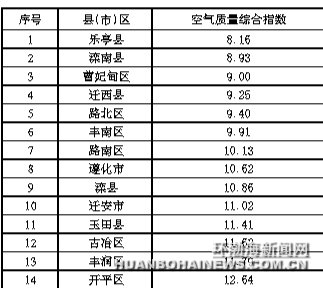 按照城市环境空气质量综合指数评价,10月份全市14个县(市)区空气质量由好到差排名依次为:乐亭县、滦南县、曹妃甸区、迁西县、路北区、丰南区、路南区、遵化市、滦县、迁安市、玉田县、古冶区、丰润区、开平区。