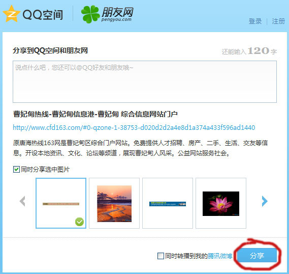 打开曹妃甸热线网站首页(www.cfd163.com),右则点击分享按钮,分享到QQ空间