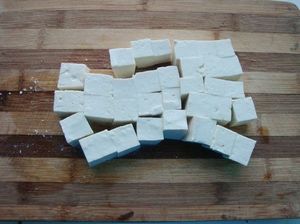 2.切好的豆腐放入沸水焯一下去除豆腥味。