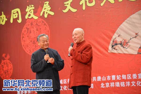 17日,相声表演艺术家姜昆、戴志诚在河北唐山曹妃甸区表演相声《乐在其外》。新华网北京频道发 李骁姗 摄