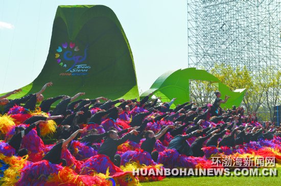 4月18日下午,2016唐山世界园艺博览会开幕式预演在世园会核心区市民广场“丹凤朝阳”雕塑南侧至临湖区域举行。图为开幕式开场舞预演现场。记者 郑勇 赵亮 摄