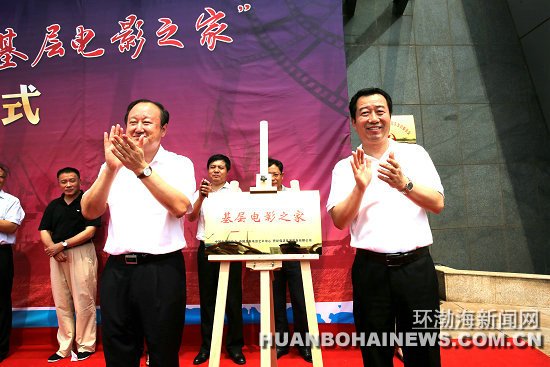 中国电影家协会分党组书记、驻会副主席张宏(图右)与唐山市曹妃甸区委副书记、区长梁振江为“基层电影之家”揭牌 记者 付卫峥 摄