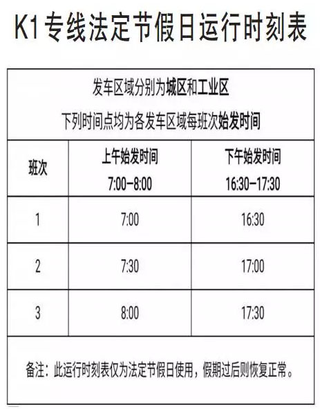 为了科学、合理地调度公交运力,避免资源浪费,从而达到动态管理的目的,使更多的百姓能够享受到公交带来的出行便利。经过我公司长期以来的多方面考证和分析,K1专线在日常中午时段和法定节假日期间运行的过程中,存在较大的空驶里程,故取消中午时段的运行班次,并于法定节假日减少运行班次,期间有出行需求的乘客可改乘K1支线往返于城区和工业区。